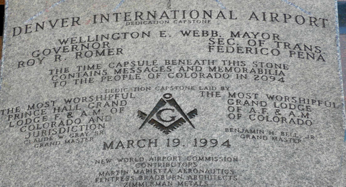 در یکی از ورودیهای اصلی فرودگاه، سنگ یادبودی وجود دارد که نماد ماسونری (Freemasons) بر روی آن دیده میشود و عبارتی به نام “New World Airport Commission” درج شده است. این موضوع باعث شد شایعههای فراوانی درباره ارتباط فرودگاه با سازمانهایی چون نیو ورلد اوردر یا انجمنهای سری شکل بگیرد.